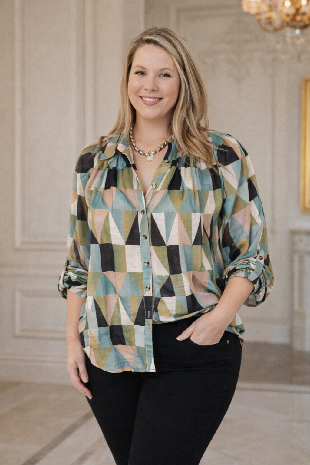 Lightweight woven top with an eye-catching patchwork geometric print