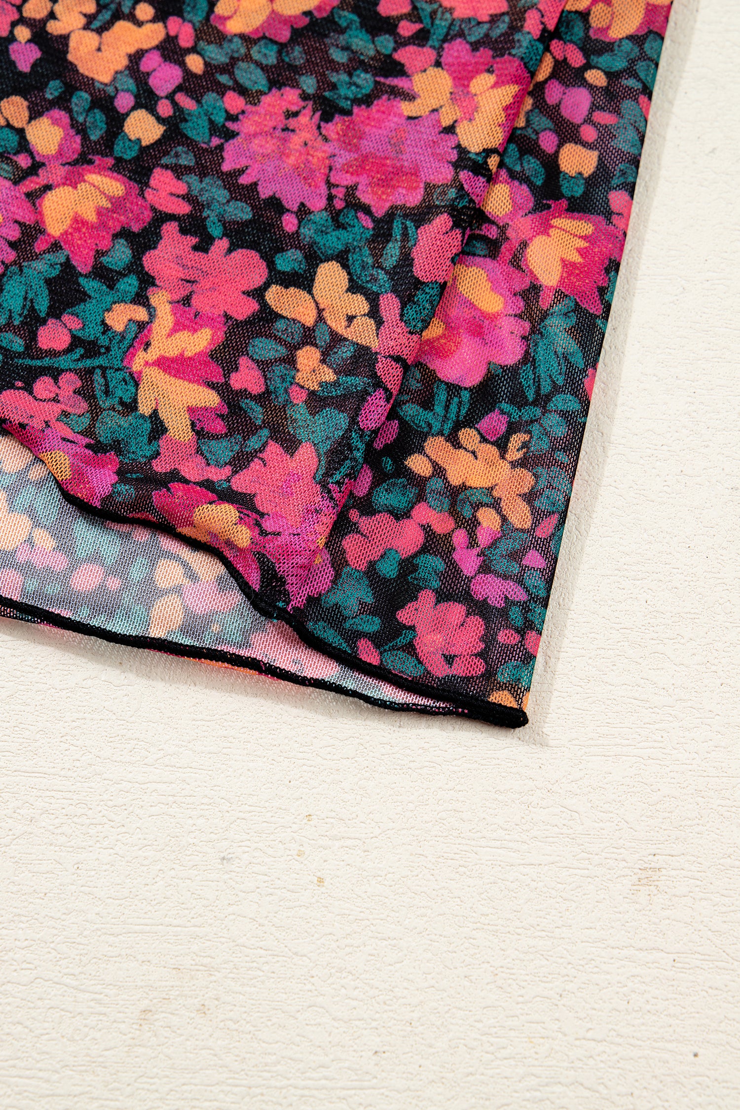 Vibrant floral print in pinks, oranges, and teal on a dark background